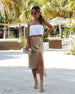 Dress up for your resy in the Always Opulent Satin Midi Skirt in gold that features a sultry slit.Styled with: Good A Gold Clutch and Camilla Top.